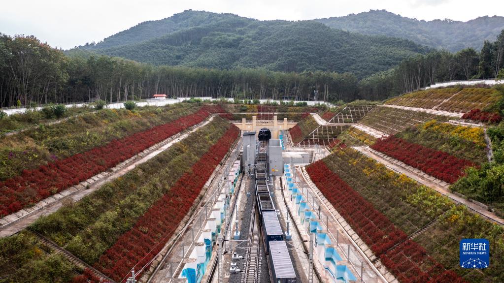 货物列车即将驶入位于中老边境的友谊隧道(2022年11月24日摄,无人机照片)。新华社记者 胡超 摄