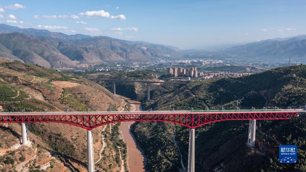 “复兴号”列车通过中老铁路元江特大桥(2022年11月23日摄,无人机照片)。新华社记者 胡超 摄
